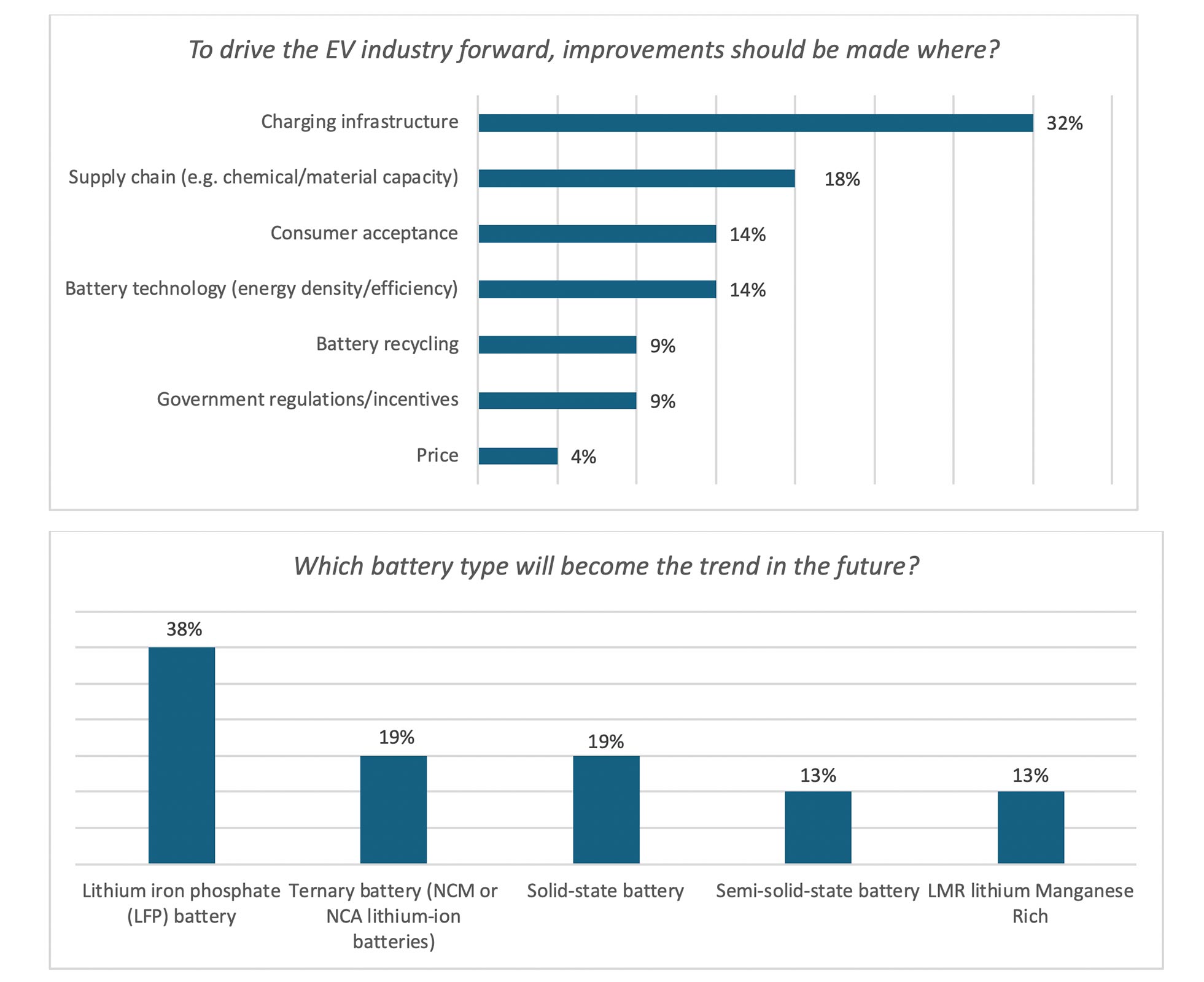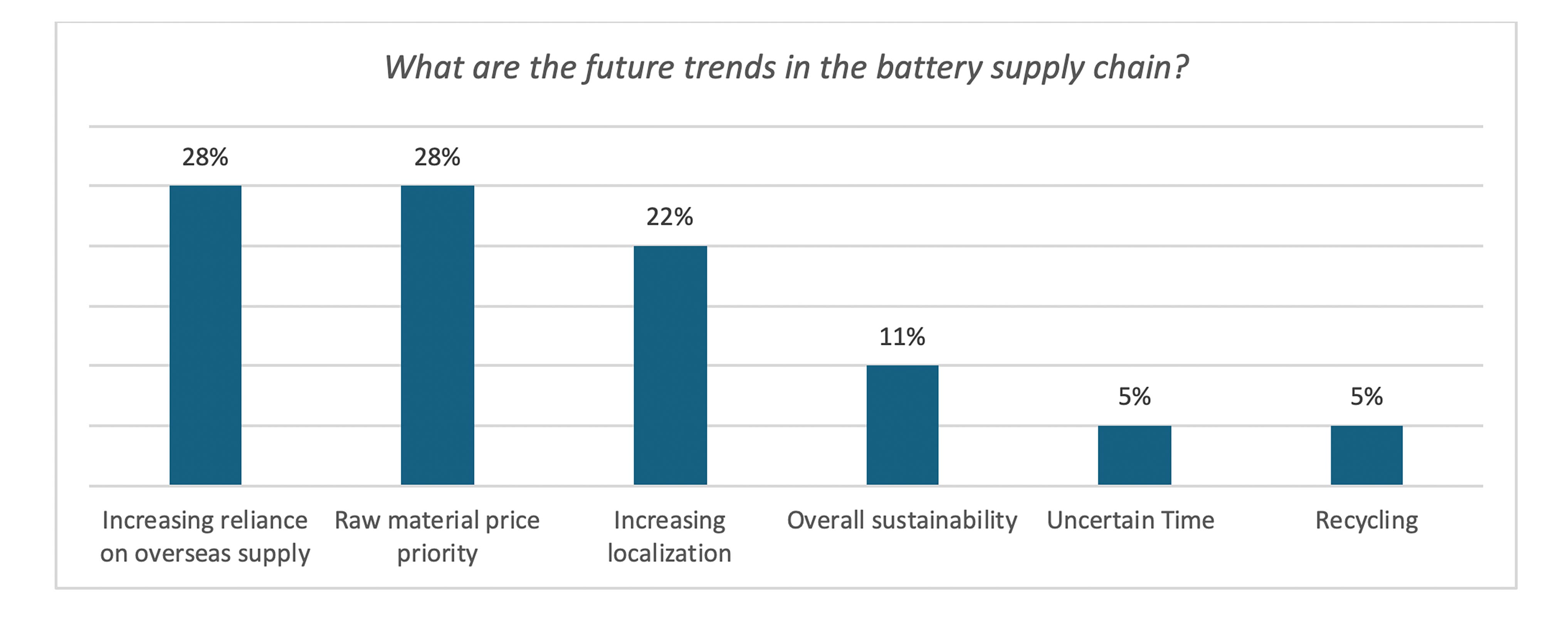 When asked “which battery type will become the trend in the future?”, responses were in favor of LFP batteries for ongoing and short-term development. Ternary batteries (NCM or NCA) and solid-state batteries were the next most mentioned with a longer-term timeline especially for solid state.