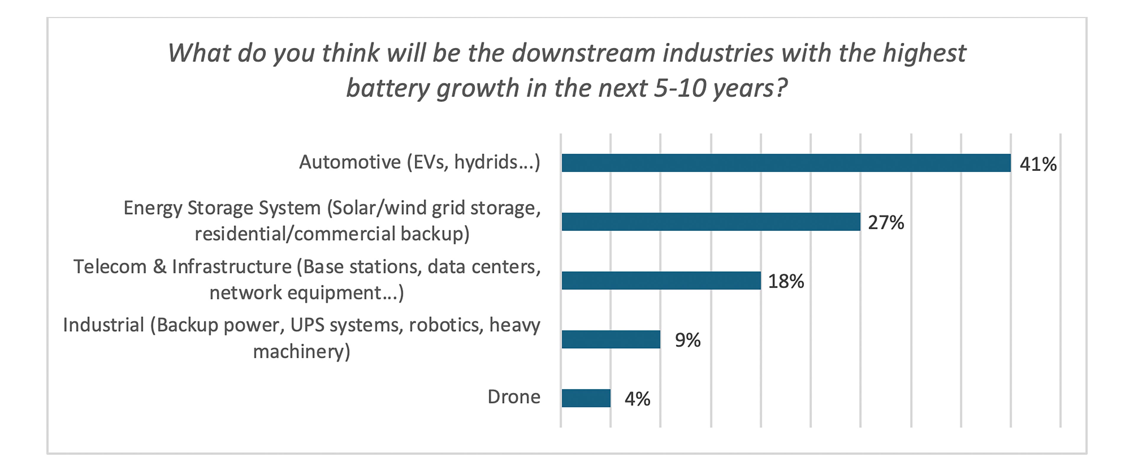 Battery technology was mentioned the third most and was explored in a subsequent question examining trends in battery chemistry.