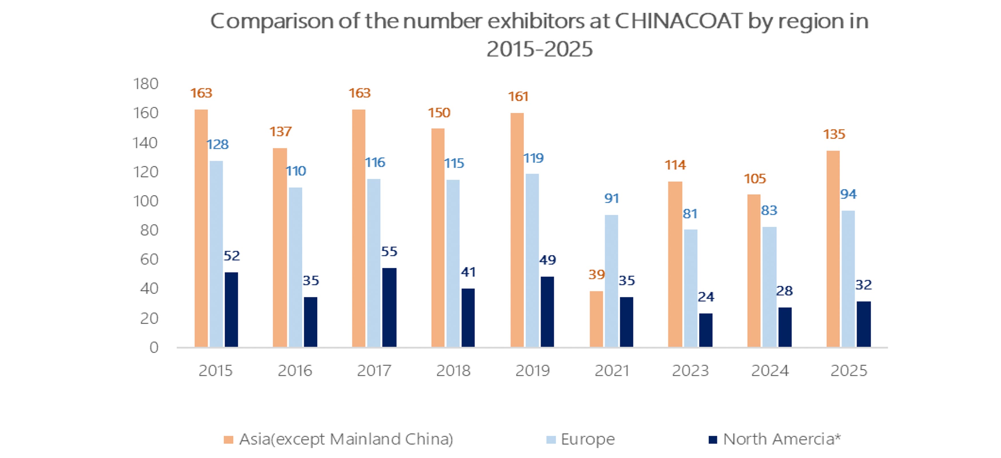 - The number of Asian exhibitors is overwhelmingly large, increasing from 896 in 2015 to 1,322 in 2025.