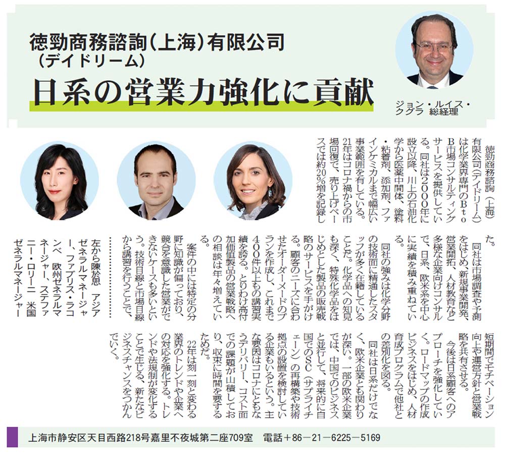 2022年3月14日、日本最大化学品メディアである化学工業日報が中国ビジネス特集を発表なされ、弊社の特徴を紹介されるほか、アジアにおけるサービス内容や日本顧客へのアプローチなどについて報告させていただきました。化学工業日報様に厚く御礼を申し上げると共に皆様へご一報を入れさせていただきたい次第で御座います。疫病が更に進行している中、(欧米や中国の)現場から離れざるを得なくなることは多々あると存じますが、現場の情報やトレンドのキャッチなど些細なことであっても、弊社がお手伝えることがあれば、是非とも気軽にご連絡の程を宜しくお願いいたします。重ね重ねではありますが、ご健康でいるよう心から願っております。
