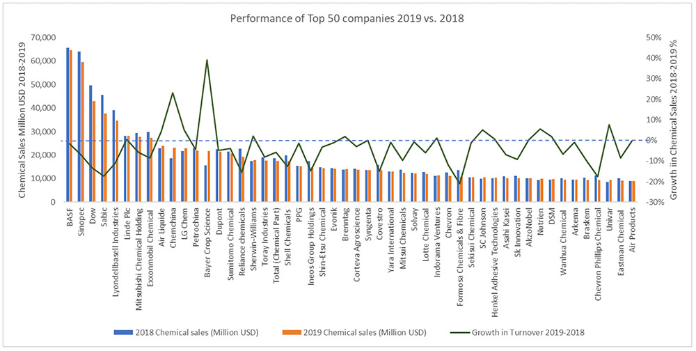 Illustration 3. Analysis of the performance of the Top 50 companies. Comparison of the Chemical-related Sales in 2018 and 2019